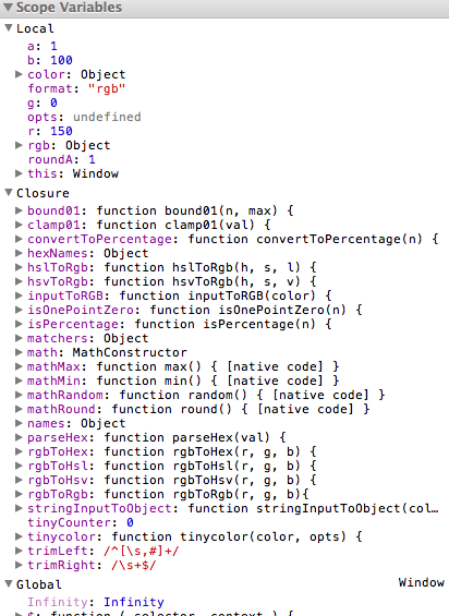 How about using the statement “debugger;” ? in chrome this forces a breakpoint if the console is open; you can freely browse the scope variables then, and when you are done you let it continue.