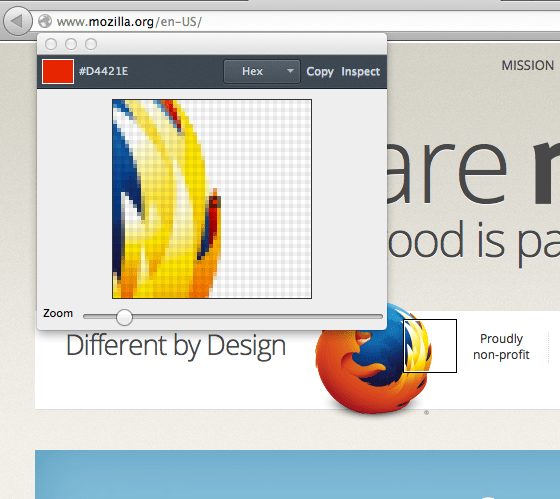 September 2013Heather and I spent some of our @FirefoxDevTools team meetup working together on an experiment we named the Pixel Inspector. The idea is to focus on an individual region of the page with an eyedropper to pick colors and a zoom feature to debug tricky alignment issues. You can get separate programs that do some of this, such as Digital Color Meter, or addons like ColorZilla, but it would be great to have something built into the developer tools to do this. Here is how it works: